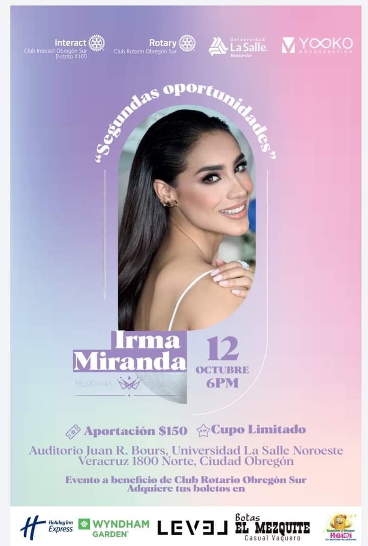 Conferencia que se ofrecerá en el Auditorio Juan R. Bours este miércoles 12 de octubre a las 6 de la tarde, a quienes deseen asistir y conocer a la ‘Mexicana Universal 2022’ y representante de México en ‘Miss Universo’ pueden adquirir sus boletos en el lobby del Wyndham Garden, de 12:00 a 7 de la tarde, los fondos que se logren reunir serán a beneficio del Club Rotario Sur.