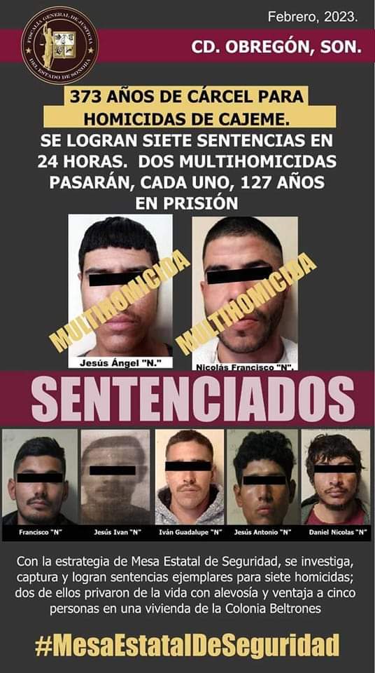 Con la estrategia de la Mesa Estatal de Seguridad se investiga, captura y logran sentencias ejemplares para siete sujetos, todos los hechos se registraron en colonias en el área urbana de Ciudad Obregón, Cajeme.