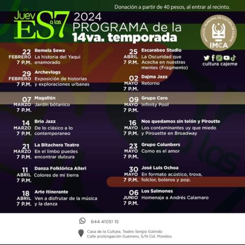 El Ayuntamiento de Cajeme a través del Instituto Municipal de Cultura en Cajeme dio a conocer que a partir del Jueves 22 de febrero dará inicio el Programa Jueves a la 7 en el Teatro Sergio Galindo Sánchez, de la Casa de la Cultura.