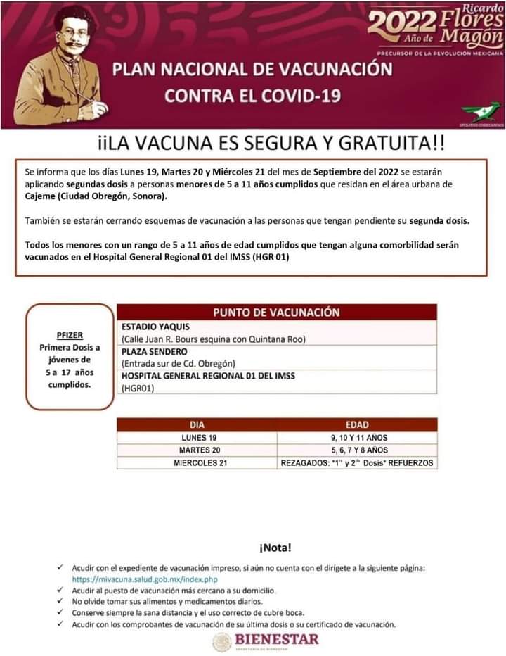 Se informa que los días Lunes 19,Martes 20 y Miércoles 21 del presente mes de Septiembre 2022, se aplicará la segunda dosis de la vacuna contra COVID-19 a menores entre 5 y 11 años de edad en la, zona urbana del municipio de Cajeme.