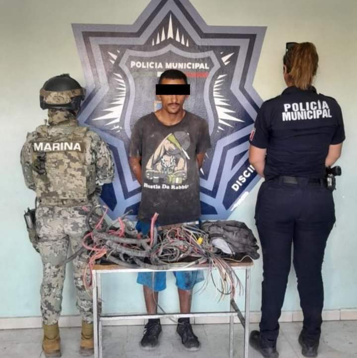 Al arribar al lugar de los hechos, los oficiales de la Policía Municipal observaron al presunto en el interior de una ambulancia de la Cruz Roja portando en sus manos un arma punzocortante, con la cual cortaba cableado que pretendía sustraer de forma ilegal, sin embargo, fue detenido rápidamente.