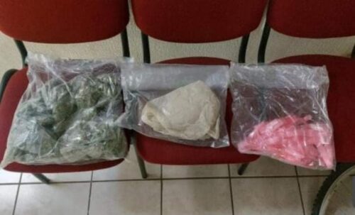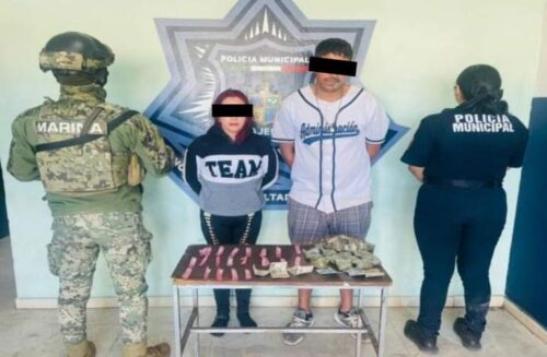 Aprehendiendo a Viridiana «N.», de 34 años y José Dolores «N.», de 37 años, a quienes tras una inspección física se le localizó entre sus vestimentas 20 envoltorios con una sustancia granulada similar a las de un narcótico y 11 dosis de una hierba verde y seca como la marihuana.
