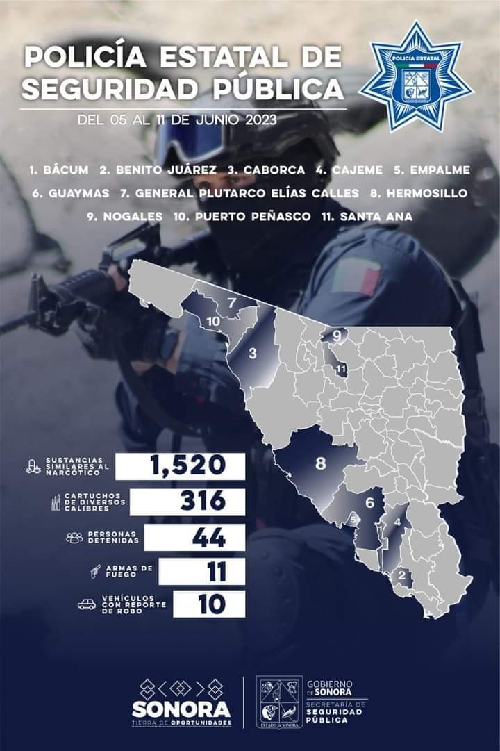 *Hermosillo, Sonora; 12 de junio de 2023.-* La detención de personas en flagrancia delictiva y el aseguramiento de armas de fuego, narcótico y vehículos recuperados fue resultado de los operativos de la Policía Estatal de Seguridad Pública (PESP) en municipios de Sonora.