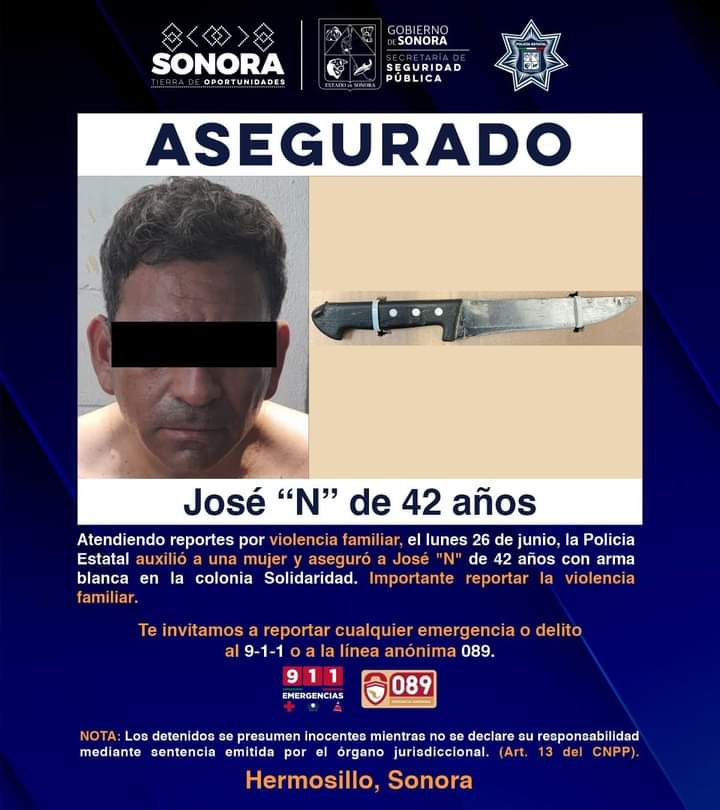 Hermosillo, Sonora; a 28 de junio del 2023.- Oficiales de la Policía Estatal de Seguridad Pública (PESP) atendieron a una mujer que reportó violencia por su pareja, logrando detener al sujeto señalado como agresor en posesión de arma blanca.