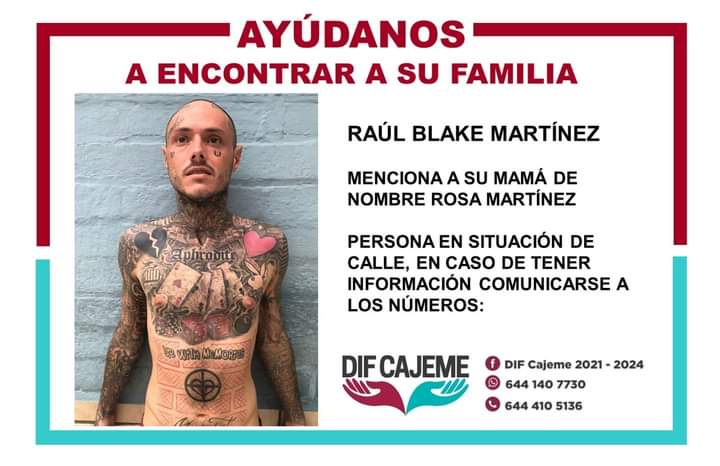 Raúl Blake Martínez, persona en situación de calle solicita el apoyo de la comunidad para localizar a sus familiares. En caso de tener información favor de comunicarse a los números señalados en la imagen: