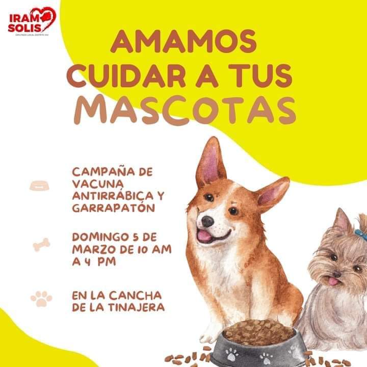 Campaña de Garrapatón y Vacuna antirrábica gratuita este Domingo 5 de Marzo de 10 am a 4 pm en la Cancha de la Tinajera. lleva a tu mascota.