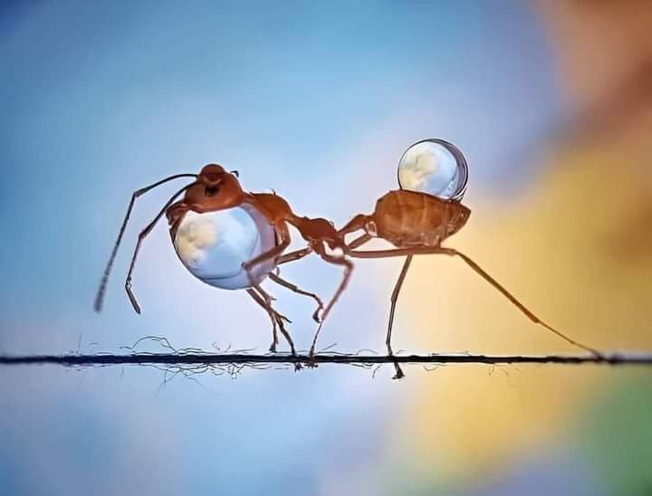 En Filipinas, se capturó una impresionante imagen de hormigas transportando pequeñas gotas de agua mientras caminaban a lo largo de una cuerda en un jardín.