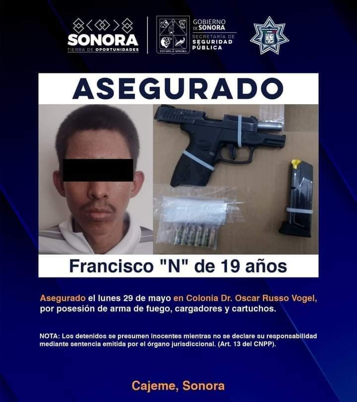 *Cajeme, Sonora; 30 de mayo de 2023.-* Como parte de la estrategia de seguridad en colonias focalizadas de Cajeme, la Policía Estatal de Seguridad Pública (PESP) logró detener a un hombre en posesión de arma de fuego y cartuchos útiles en la colonia Óscar Russo Vogel.