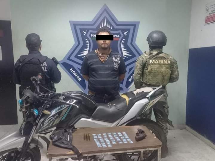 Una persona del sexo masculino fue capturada durante un operativo nocturno realizado por elementos de la Secretaría de Seguridad Pública Municipal y Marina al sur de la ciudad, asegurando drogas y un arma de fuego.