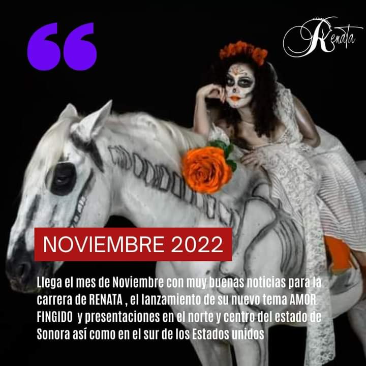 Llega el mes de Noviembre con muy buenas noticias para la carrera de RENATA, el lanzamiento de su nuevo tema AMOR FINGIDO y presentaciones en el norte y centro del estado de Sonora así como en el sur de los Estados unidos.