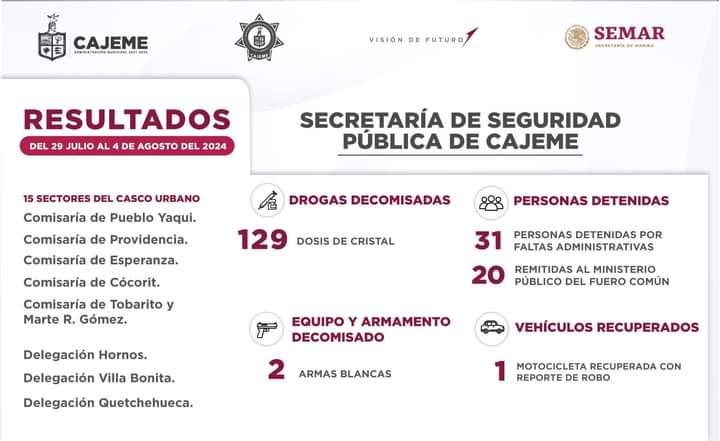 Las acciones de la Secretaría de Seguridad Pública en Cajeme dieron como resultado un total de 51 personas detenidas por elementos de la Policía Municipal en coordinación con la Secretaría de Marina y las diversas corporaciones, de los cuales 31 fueron por faltas administrativas y 20 se turnaron al Ministerio Público del Fuero Común.