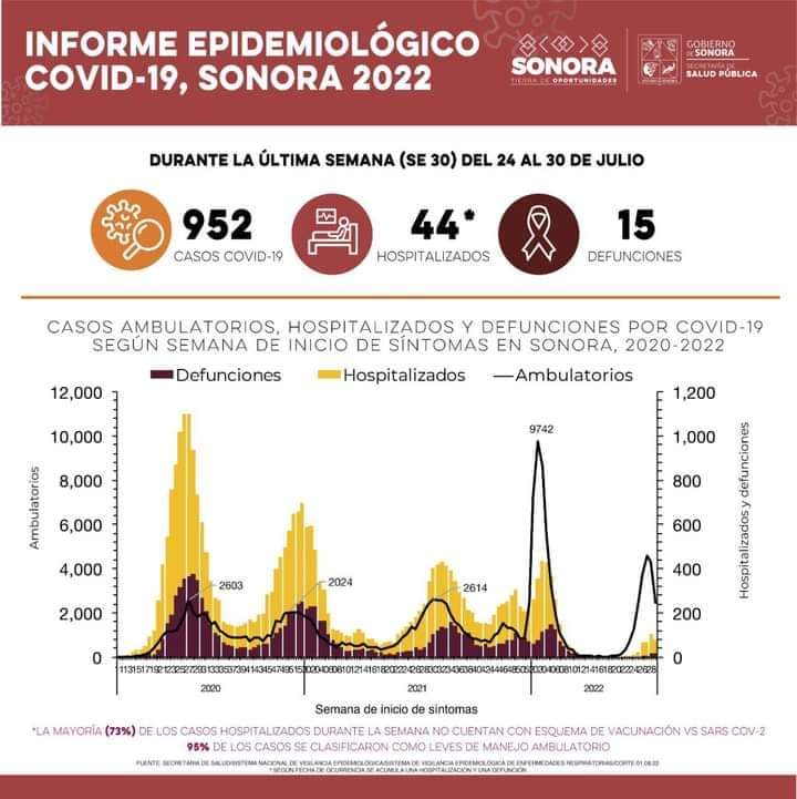 Hermosillo, Sonora; 1 de agosto de 2022.- La Secretaría de Salud (SSA) confirmó 952 casos de Covid-19 y 15 defunciones a causa de la enfermedad durante la semana epidemiológica 30, la cual abarca del 24 al 30 de julio.