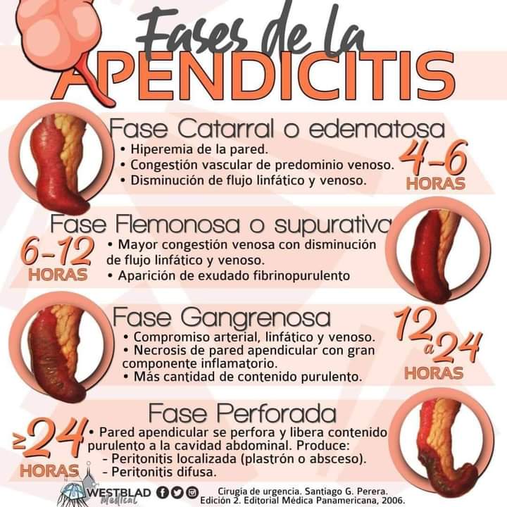 Una vez que la inflamación y la necrosis ocurren, el apéndice se encuentra en riesgo de perforación, lo que conduce a la formación de abscesos localizados o peritonitis difusa. El tiempo para la perforación apendicular es variable; de manera general, se correlaciona la perforación con la evolución de los cuadros apendiculares: sin perforación apendicular en menos de 24 horas de evolución y con perforación en más de 48 horas.