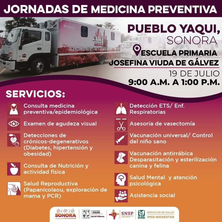 Por lo que invita a las familias de Pueblo Yaqui, Marte R. Gómez y de Quetchehueca para que a los días viernes 19 de julio, 9 y 23 de agosto, de manera respectiva, acudan a recorrer cada una de la unidades y consultorios móviles, donde se les atenderá desde las 9:00 a las 13:00 horas.