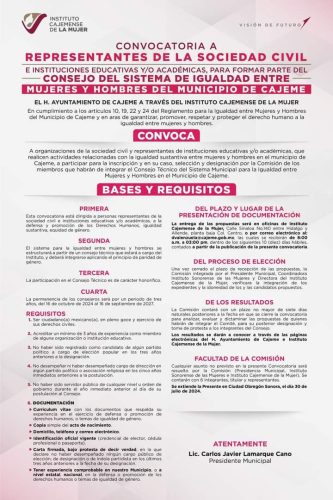 Con el fin de garantizar la defensa y promoción de los derechos humanos y la igualdad de género, el Ayuntamiento de Cajeme, a través del Instituto Cajemense de la Mujer (ICM), convoca a organizaciones de la sociedad civil e instituciones educativas que realicen actividades relacionadas con la igualdad sustantiva entre mujeres y hombres en el municipio de Cajeme, a participar la inscripción y, en su caso, selección y designación por la Comisión de los miembros que habrán de integrar el Consejo Técnico del Sistema Municipal para la Igualdad entre Mujeres y Hombres del Municipio, mismo que desempeñará sus funciones a partir del 16 de octubre de 2024 al 15 de septiembre de 2027.