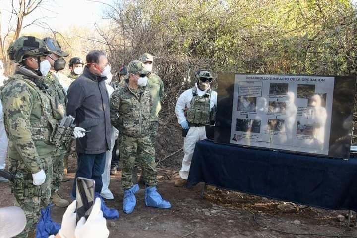 En compañía de José Rafael Ojeda Durán, secretario de Marina, el mandatario estatal se apersonó en el sitio, donde destacó que con el aseguramiento del laboratorio ubicado en la comunidad de Rancho Viejo, municipio de Quiriego, se brinda un duro golpe al crimen organizado, al cortar el flujo financiero que operan en la zona y en consecuencia reducen su capacidad operativa.