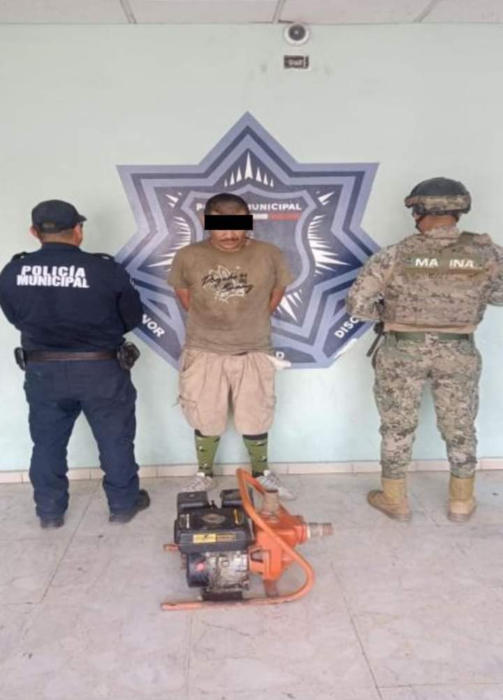 La segunda aprehensión se originó en la colonia Centro, luego de que al patrullar elementos de la corporación policial observaran en la pared de un predio un boquete, del cual salió el presunto cargando entre sus manos una motobomba.