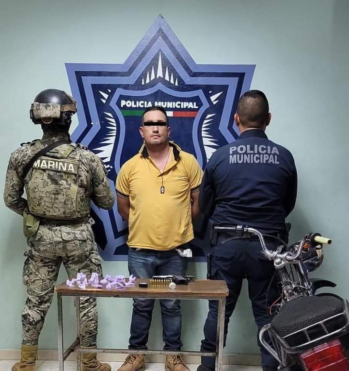 Un hombre fue capturado al sur de la ciudad, por agentes de la Policía Preventiva de la Secretaría de Seguridad Pública Municipal, logrando el aseguramiento de un arma de fuego, diversas dosis de cristal y cartuchos útiles, además de una motocicleta con reporte de robo de la marca Kurazai.
