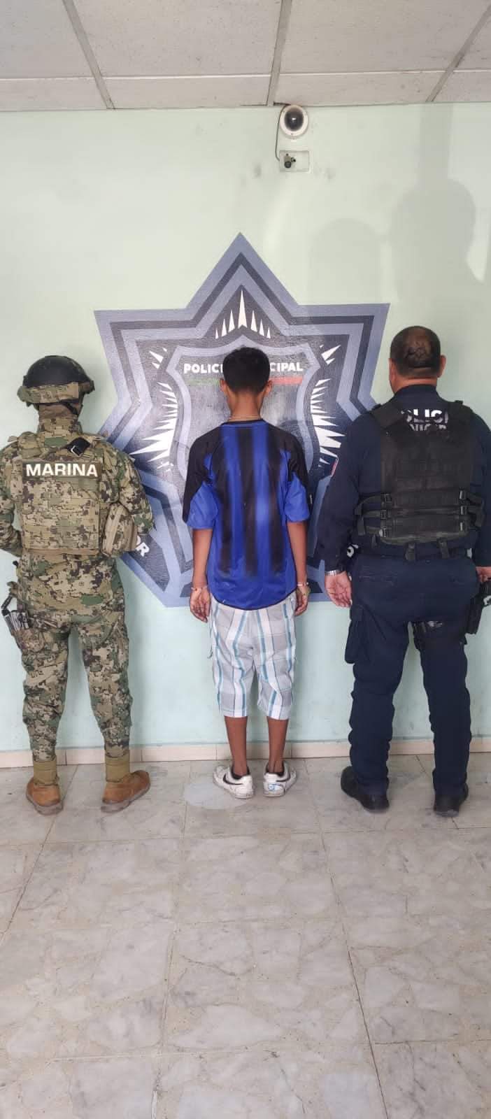Derivado de un operativo especial agentes del Grupo de Investigación Criminal de la Secretaría de Seguridad Pública Municipal en coordinación con Marina, detuvieron a un menor de 17 años, con orden de aprehensión por el delito de robo agravado ejecutado con violencia física y moral en las personas en establecimiento comercial abierto al público.