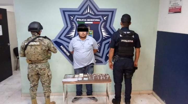 Durante operativos nocturnos para la prevención de los delitos, elementos de la Secretaría de Seguridad Pública y Marina, llevaron a cabo la captura de un hombre en la colonia Infonavit Yukujimari, a quien se le aseguraron de entre su vestimenta diversos envoltorios de cristal.
