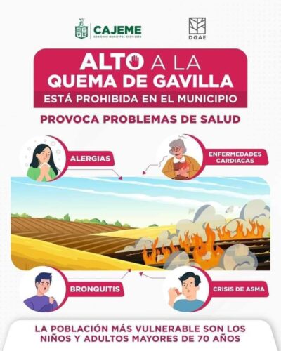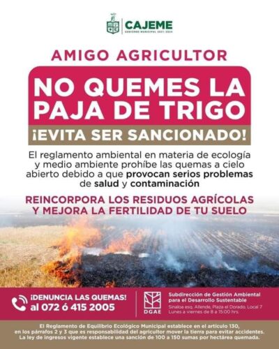 A fin de contrarrestar el riesgo para la salud de los cajemenses, así como los problemas ambientales, durante el programa Diálogo con Cajeme, el funcionario reiteró el llamado a los agricultores del Valle del Yaqui para evitar la quema de gavilla a cielo abierto durante el presente ciclo, la cual está prohibida en el reglamento ambiental en materia de ecología, de lo contrario, podrían ser acreedores a una multa que va desde 100 a 150 Unidades de Medida de Actualización (UMAS), es decir de 11 mil a 16 mil pesos por hectárea de cultivo.