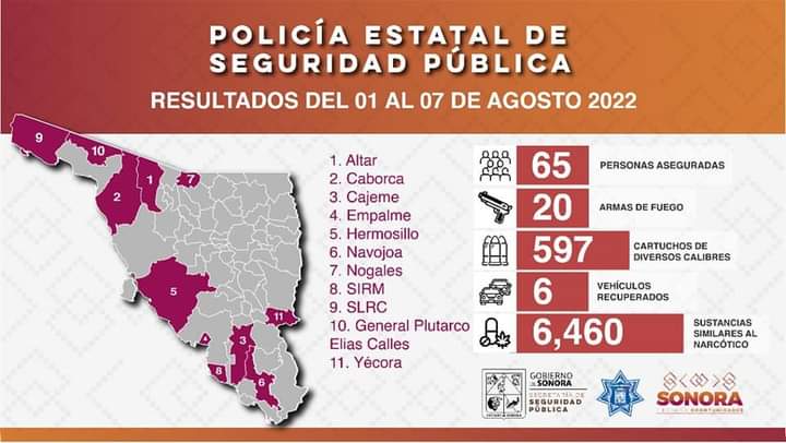 *Hermosillo, Sonora; 8 de agosto de 2022.-* Oficiales de la Policía Estatal de Seguridad Pública (PESP) generaron resultados contra el delito, durante la primera semana de agosto en municipios de Sonora, donde se logró el aseguramiento de personas, además de la incautación de sustancias prohibidas, armas y vehículos robados.