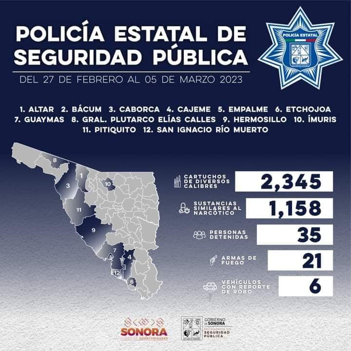 Las acciones implementadas en los municipios del estado dieron como resultado aseguramientos en Hermosillo, Cajeme, Bácum, San Ignacio Río Muerto, Guaymas, Empalme, Caborca, Pitiquito, General Plutarco Elías Calles, Ímuris, Altar y Etchojoa.
