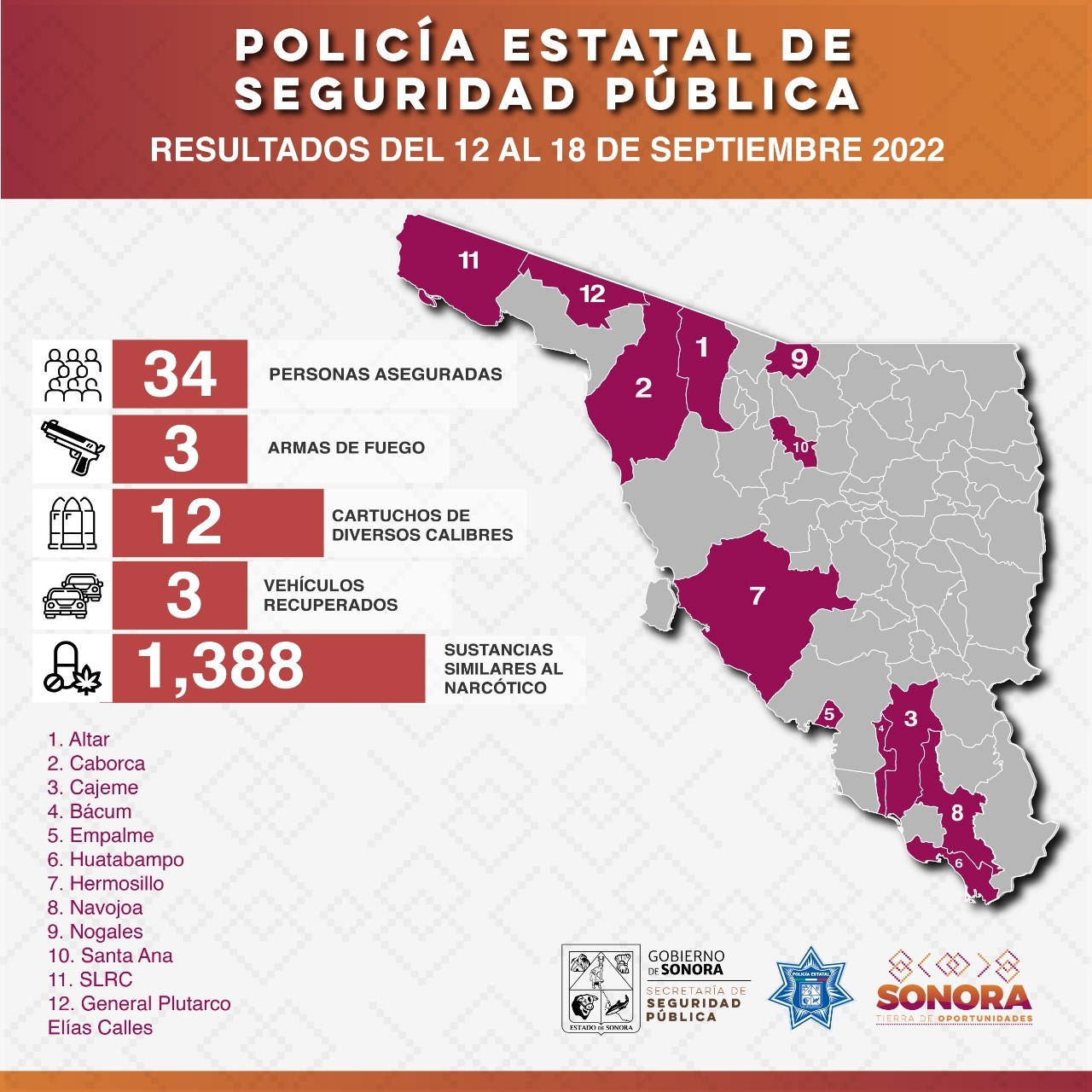 En la última semana, del 12 al 19 de septiembre, la PESP registró aseguramientos en Altar, Caborca, Cajeme, Bácum, Empalme, Huatabampo, Hermosillo, Navojoa, Nogales, Santa Ana, San Luis Río Colorado y General Plutarco Elías Calles.