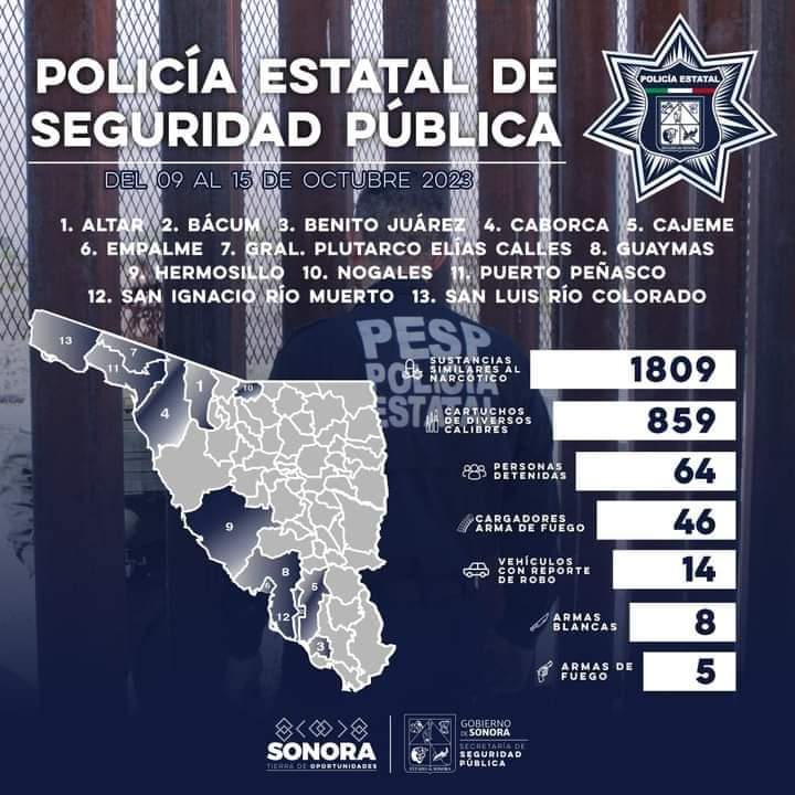 Hermosillo, Sonora; a 16 de octubre del 2023.- En acciones de prevención y combate al delito que la Policía Estatal de Seguridad Pública (PESP) realizó esta semana en Sonora, se logró sacar de las calles más de mil 809 dosis de sustancias similares al narcótico.