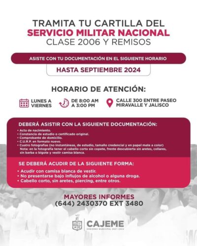Para mayor información sobre el trámite de la cartilla militar podrán comunicarse al 6442430370 extensión 3480, en horario de oficina de lunes a viernes.