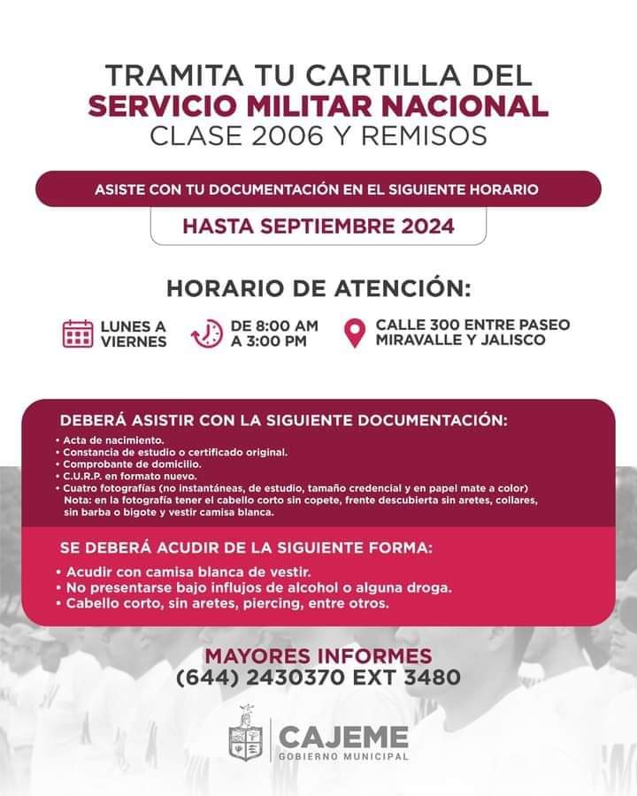 La Junta Municipal de Reclutamiento informa a las y los jóvenes interesados en la realización del trámite para la Cartilla del Servicio Militar, clase 2006, remisos y mujeres voluntarias, mismo que se llevará a cabo como fecha límite hasta el mes de septiembre del presente año.