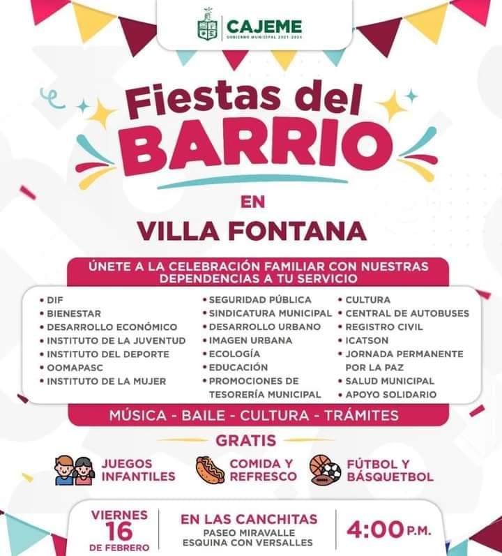 El Ayuntamiento de Cajeme, a través del el Instituto Cajemense de la Juventud (ICJ), invita a la comunidad en general a participar en una edición más del programa Fiesta del Barrio que se realizará este viernes 16 de febrero, a partir de las 16:00 horas, en las canchitas de la colonia Villa Fontana, ubicadas en la esquina de las calles Paseo Miravalle y Versalles, donde las familias del sector tendrán la oportunidad de divertirse y aprovechar los servicios de las diferentes dependencias de los tres órdenes de gobierno.