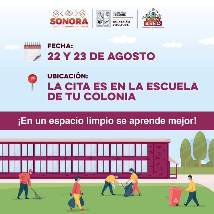 Hermosillo, Sonora; 14 de agosto de 2023.- Para que las escuelas públicas de nivel básico se encuentren limpias y preparadas para recibir a los más de 440 mil estudiantes que regresarán a las aulas el lunes 26 de agosto, la Secretaría de Educación y Cultura (SEC) invita a la sociedad en general a participar en la jornada de limpieza escolar «Pilas con el aseo».