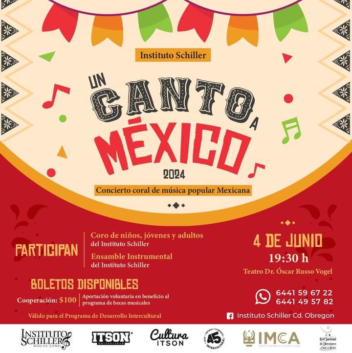 El Instituto Municipal de Cultura de Cajeme (IMCCA), y el Instituto Schiller invitan a la comunidad a su Concierto de Gala “Un Canto a México”, mismo que se llevará a cabo el martes 4 de junio, a las 19:30 horas, en el teatro Doctor Oscar Russo Vogel.