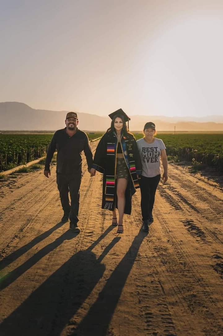 Jennifer Rocha, decidió tomarse las fotos de graduación en los campos agrícolas donde trabajó con sus padres desde que estaba en la secundaria. Rocha incluyó a sus padres en las fotografías para agradecerles por enseñarle la importancia de tener una educación.