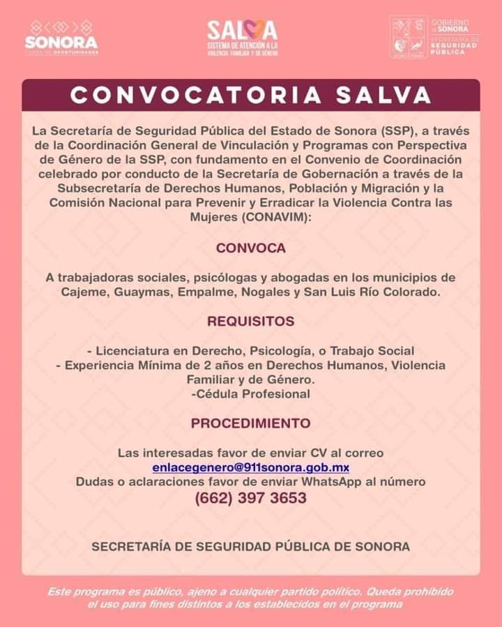 La fecha límite para la recepción de currículums es el próximo viernes 12 de agosto al correo electrónico enlacegenero@911sonora.gob.mx y, en caso de dudas, las interesadas podrán comunicarse al WhatsApp (662) 397 3653.