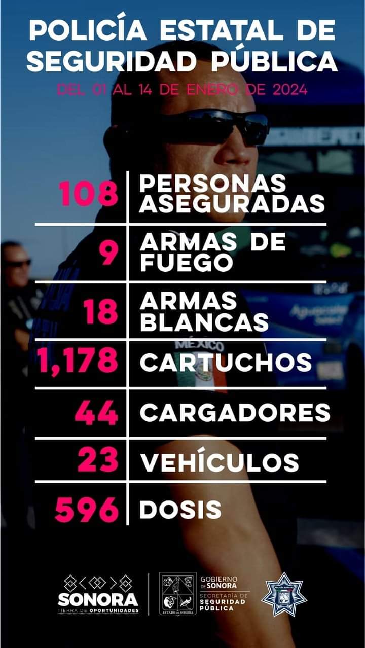 Hermosillo, Sonora; 16 de enero del 2024.- Durante las acciones de prevención y combate al delito, la Policía Estatal de Seguridad Pública (PESP) realizó el aseguramiento de 108 personas por diversos delitos en municipios de Sonora.