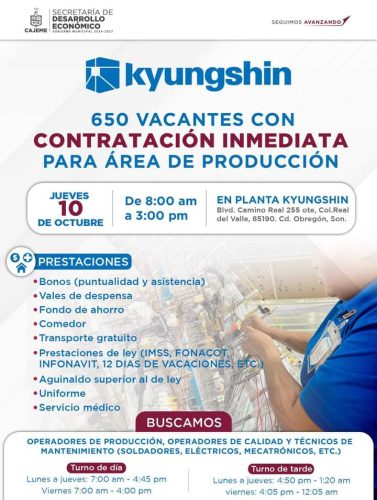 Durante el programa Diálogo con Cajeme, el Secretario de Desarrollo Económico, Fernando Durazo Picos señaló que puestos de trabajo a contratar son para operadores de producción, operadores de calidad y técnicos en mantenimiento (soldadores eléctricos, mecatrónicos y otros), quienes podrán laborar en turno matutino, de 7:00 a 16:45 de lunes a jueves y viernes de 7:00 a 16:00 horas o en turno vespertino de 16:50 a 1:20 horas de lunes a jueves y viernes de 16:05 a 12:05 horas.