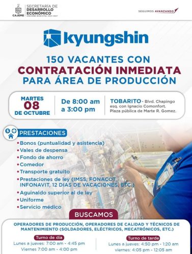 Este martes 8 de octubre se llevará a cabo la primera feria del empleo en la zona rural de municipio, donde la empresa de autopartes Kyungshin ofrecerá 150 vacantes con contratación inmediata para el área de producción, la cita es en la plaza pública del Tobarito, ubicada en bulevar Chapingo, esquina con Ignacio Comonfort, de 8:00 a 15:00 horas.