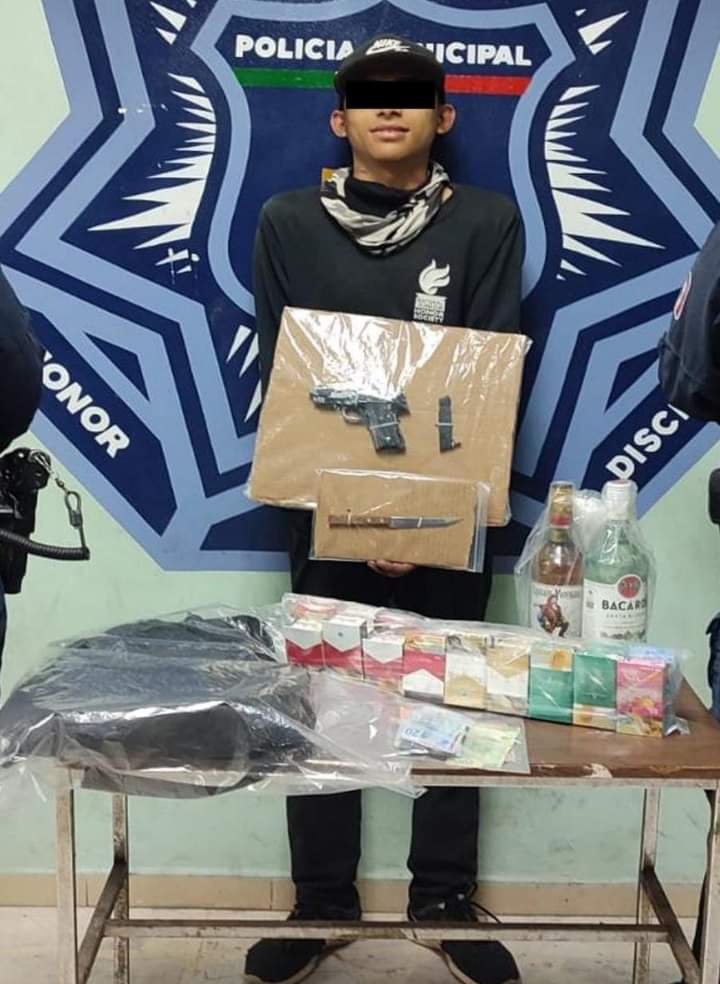 En flagrancia del delito intentando asaltar una tienda de conveniencia fue detenido por agentes de la Policía Municipal, Leonardo Antonio “N.”, de 18 años de edad, quien portaba además un arma de fuego.