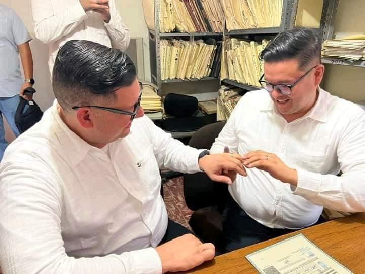 Gracias a que la ley dispone desde el 22 de octubre de 2021 que personas del mismo sexo pueden contraer matrimonio el pasado viernes 26 de agosto en el registro civil de nuestro amado pueblo Vicam Estación en la Nación de los Yaquis, y aunque los contrayentes Erwin Manuel Moreno y Elliot López Elias no son originarios de este terruño, sienten un cariño especial por nuestra comunidad, pues lazos amistosos han hecho que ellos hayan decidido consumar su matrimonio en nuestro municipio, en el que fungió como Juez de Paz Flor Daniela Cibrian Barra.