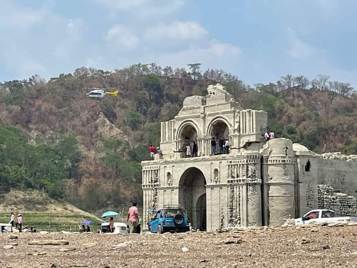 La basílica de Quechula en Chiapas ha quedado al descubierto debido a la sequía. Esta iglesia, construida en el siglo XVI y anteriormente sumergida por el río Grijalva hasta la construcción de la presa Malpaso en 1966, ahora está completamente visible.