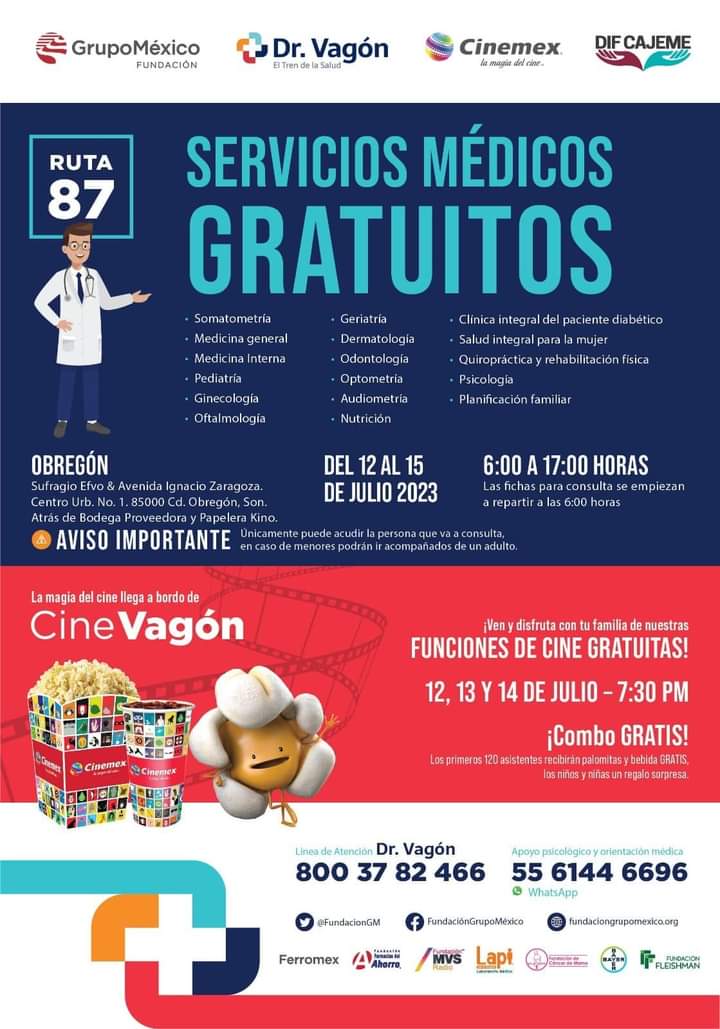 Los servicios de salud estarán abiertos para toda la familia gracias a Dr. Vagón, el tren de la salud ???? desde el 12 hasta el 15 de julio, recomendamos acudir temprano debido a que las fichas consulta se empiezan a repartir a partir de las 6:00 a.m. y se atiende hasta las 5:00 p.m.