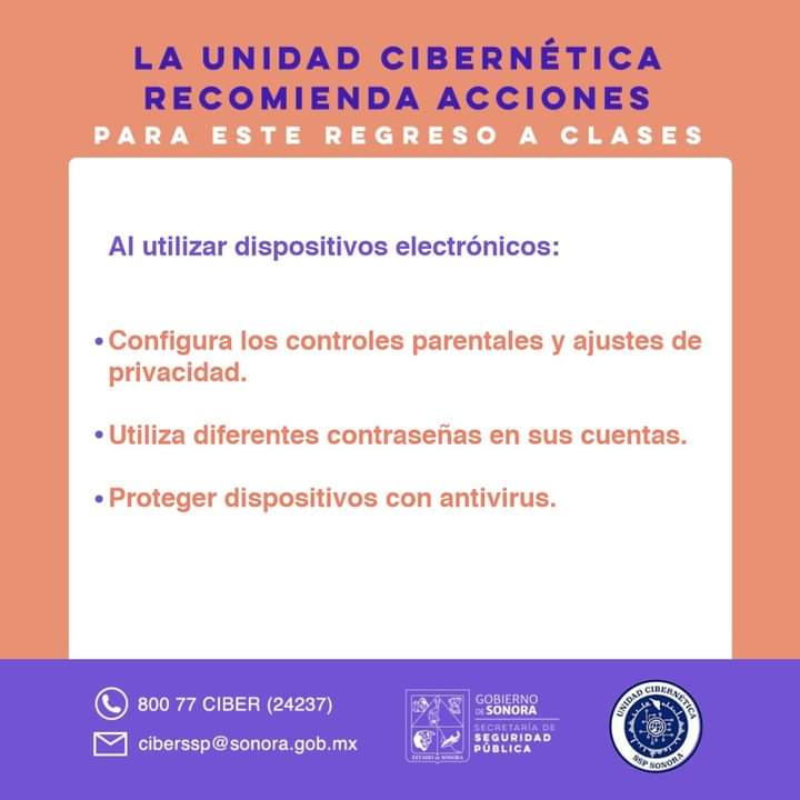 Para asesorías y mayor información, la Unidad Cibernética de la Secretaría de Seguridad Pública puso a disposición el teléfono 800-77-CIBER (24237) y el correo electrónico ciberssp@sonora.gob.mx.
