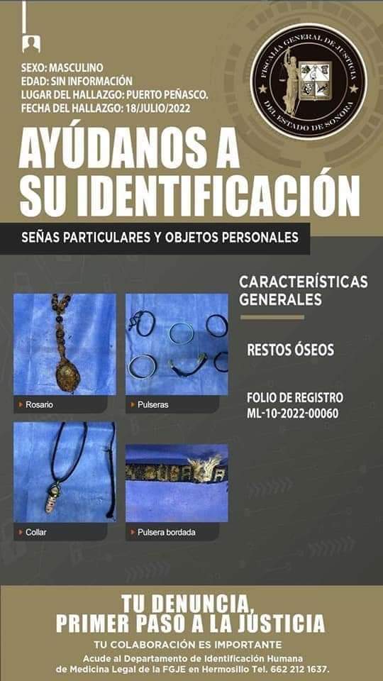 Puerto Peñasco, Sonora, julio 20 de 2022.- Luego de recuperar restos óseos en el acantilado de las faldas del cerro La Ballena, con apoyo de Bomberos, la Fiscalía de Sonora realizará los análisis con pruebas científicas para obtener su identificación, pero también, mediante una cédula Id Sonora, solicita la ayuda de la ciudadanía.