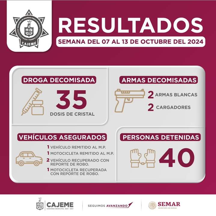La Secretaría de Seguridad Pública Municipal de Ciudad Obregón Sonora México sigue comprometida con el bienestar de todas y todos los ciudadanos. A continuación, presentamos los resultados del trabajo coordinado durante la semana del 7 al 13 de octubre de 2024.