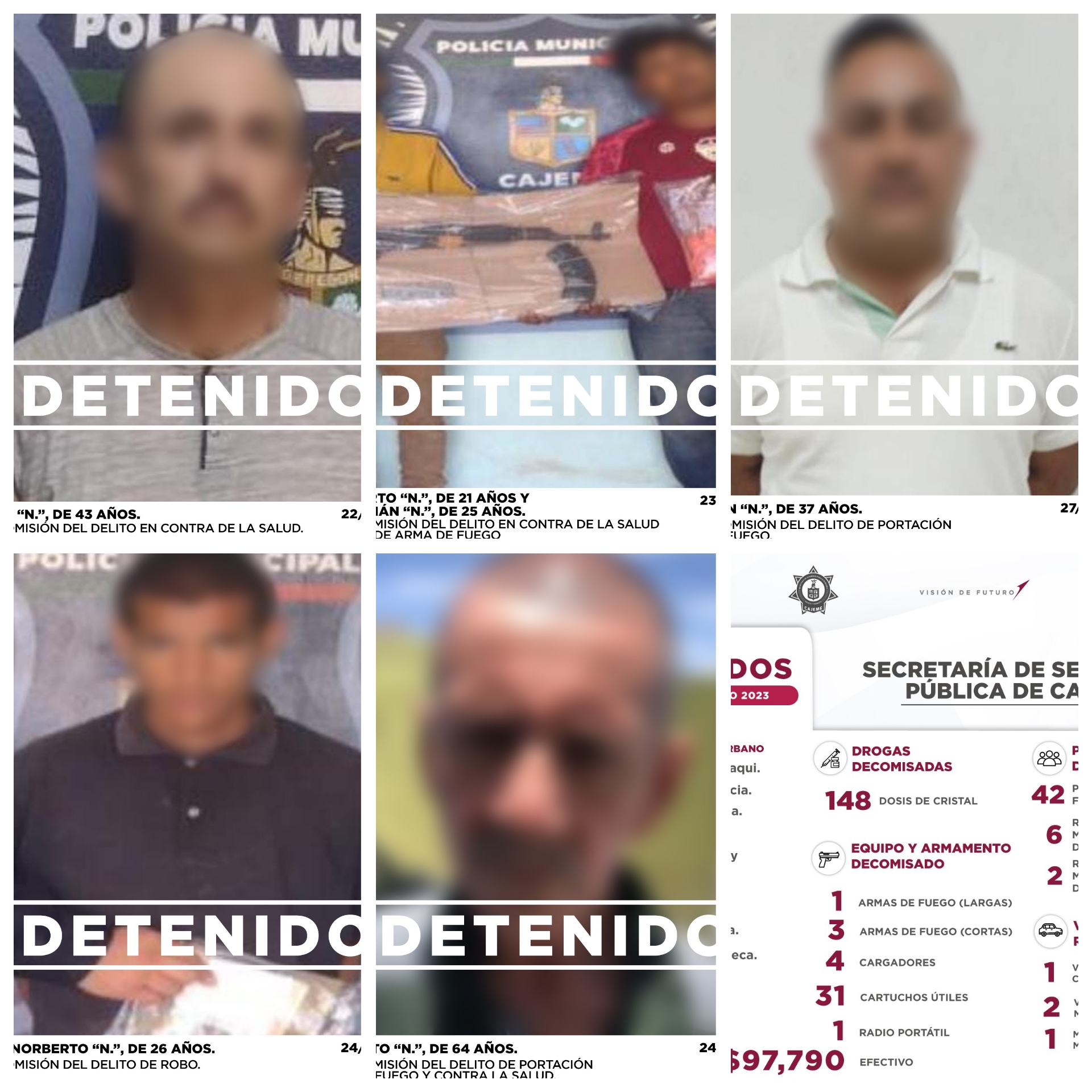 Algunos de los detenidos fueron Juan Pablo “N.”, de 23 años, por la presunta comisión del delito de allanamiento; Juan Pablo “N.”, de 43 años, por la presunta comisión del delito en contra de la salud; Jesús Alberto “N.”, de 21 años y Carlos Adrián “N.”, de 25 años, por la presunta comisión del delito en contra de la salud y portación de arma de fuego; Francisco Norberto “N.”, de 26 años, presunta comisión del delito de robo; Raúl Ernesto “N.”, de 64 años, por la presunta comisión del delito de portación de armas de fuego y contra la salud; Juan Ramón “N.”, de 37 años, por la presunta comisión del delito de portación de arma de fuego; entre otros.