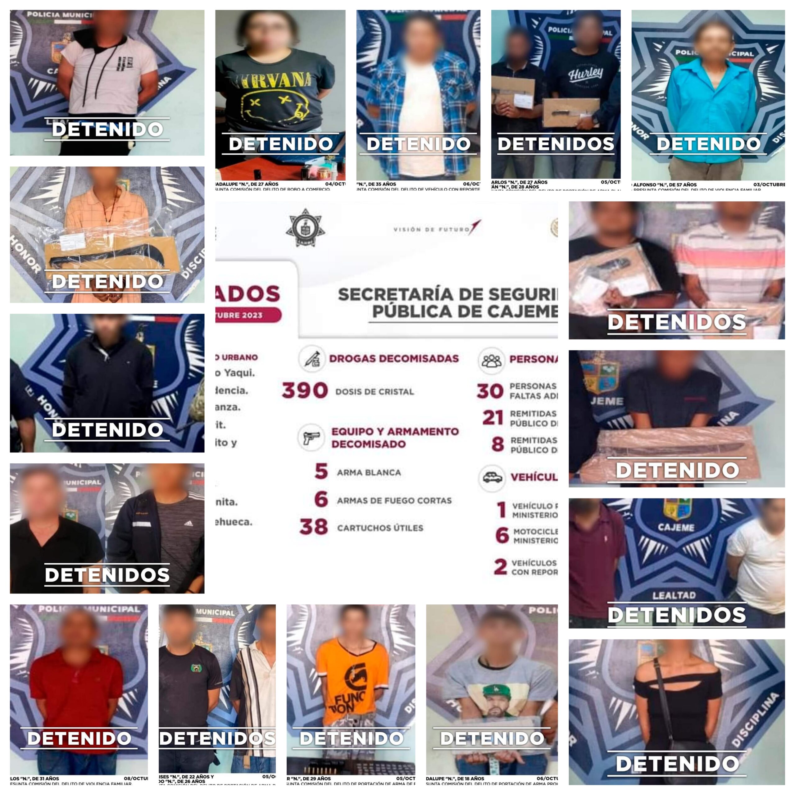 Las acciones de la Secretaría de Seguridad Pública en Cajeme dieron como resultado un total de 59 personas detenidas por elementos de la Policía Municipal en coordinación con la Secretaría de Marina y las diversas corporaciones, de los cuales 30 fueron por faltas administrativas, 21 se turnaron al Ministerio Público del Fuero Común y 8 al Federal.
