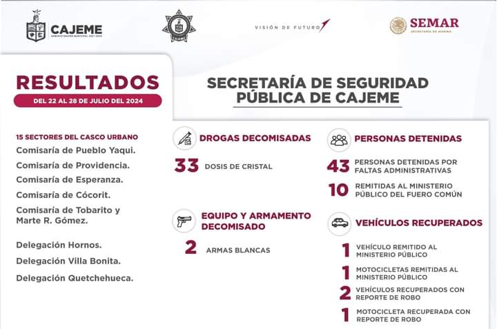 Las acciones de la Secretaría de Seguridad Pública en Cajeme dieron como resultado un total de 53 personas detenidas por elementos de la Policía Municipal en coordinación con la Secretaría de Marina y las diversas corporaciones, de los cuales 43 fueron por faltas administrativas y 10 se turnaron al Ministerio Público del Fuero Común.