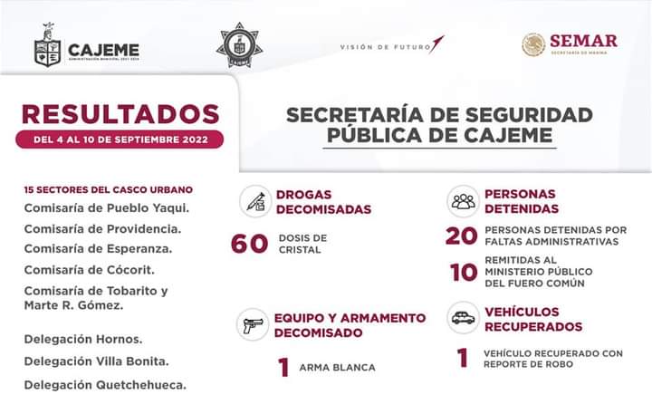 Las acciones de la Secretaría de Seguridad Pública en Cajeme dieron como resultado un total de 30 personas detenidas por elementos de la Policía Municipal en coordinación con la Secretaría de Marina y las diversas corporaciones, de los cuales 20 fueron por faltas administrativas y 10 se turnaron al Ministerio Público del Fuero Común.